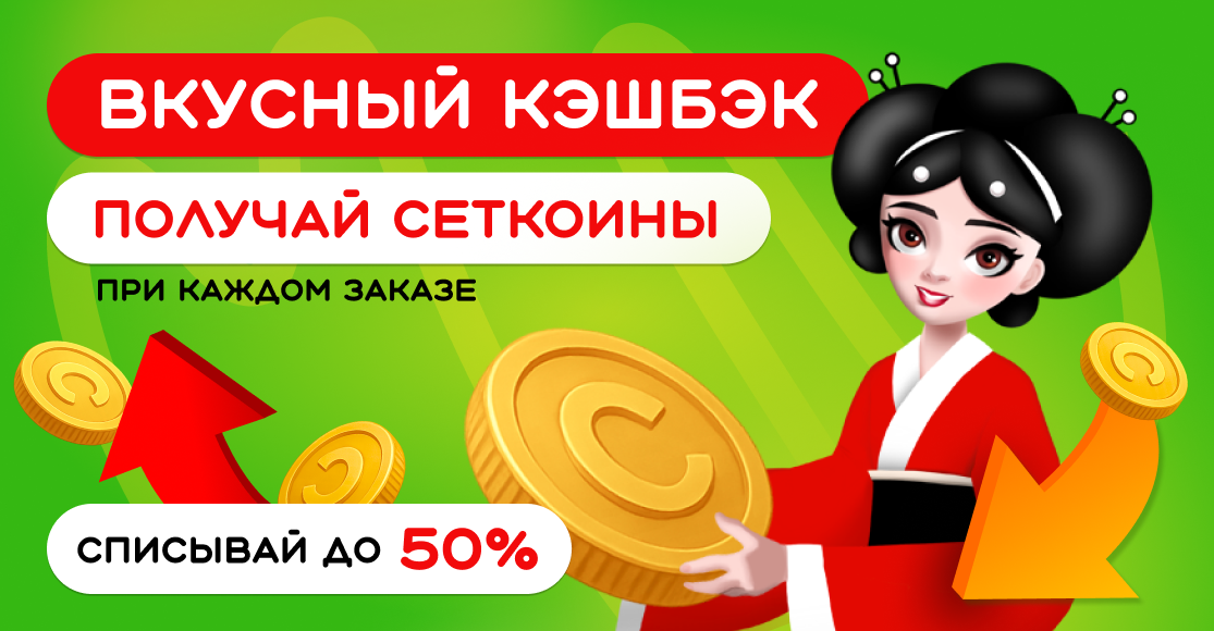 Вкусный кэшбек — это бонусная программа СУШИСЕТ, позволяющая копить баллы за покупки, а затем расплачиваться этими баллами при оформлении заказов на сайте и в мобильном приложении СУШИСЕТ.