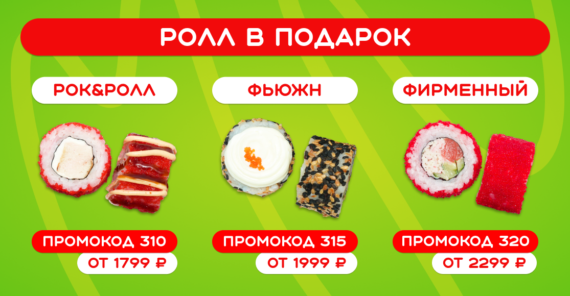 • При заказе от 1799₽ - Ролл Рок & ролл в подарок (Промокод: 310)